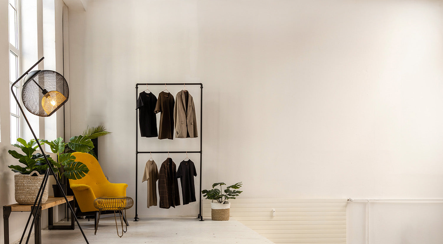 Setze stilvolle Akzente mit unseren Kleiderständern aus robustem Stahlrohr – wahlweise mit oder ohne Holzablage.