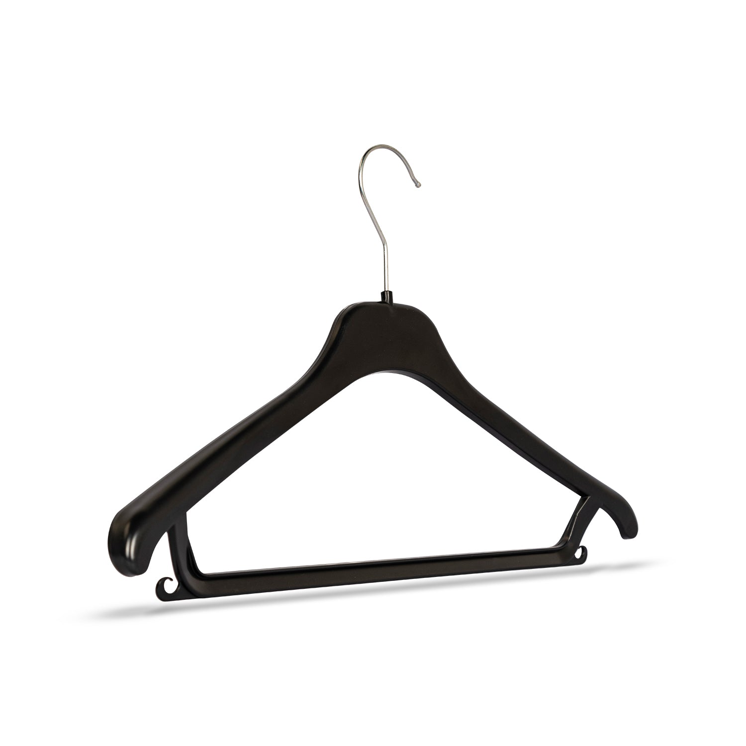 Die leicht geschwungene Form passt sich der natürlichen Schulterlinie der Kleidung an und unterstützt eine formschonende Aufhängung. Ein integrierter Hosensteg mit Rockhaken ermöglicht zusätzlich das Aufhängen von Hosen oder Röcken.