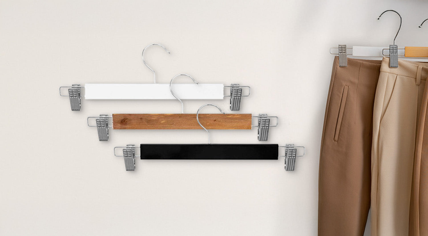 Klammerbügel aus Holz sind ideal für die Aufbewahrung für Hosen, Röcke oder Shorts.