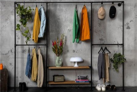 Robuste Kleiderstangen aus Stahl – minimalistisch, stabil und vielseitig. Mit Holzablagen für extra Stauraum.